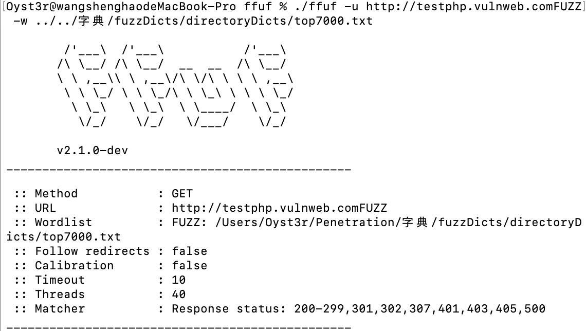 ./ffuf -u http://testphp.vulnweb.comFUZZ -w ../../字典/fuzzDicts/directoryDicts/top7000.txt -recursion