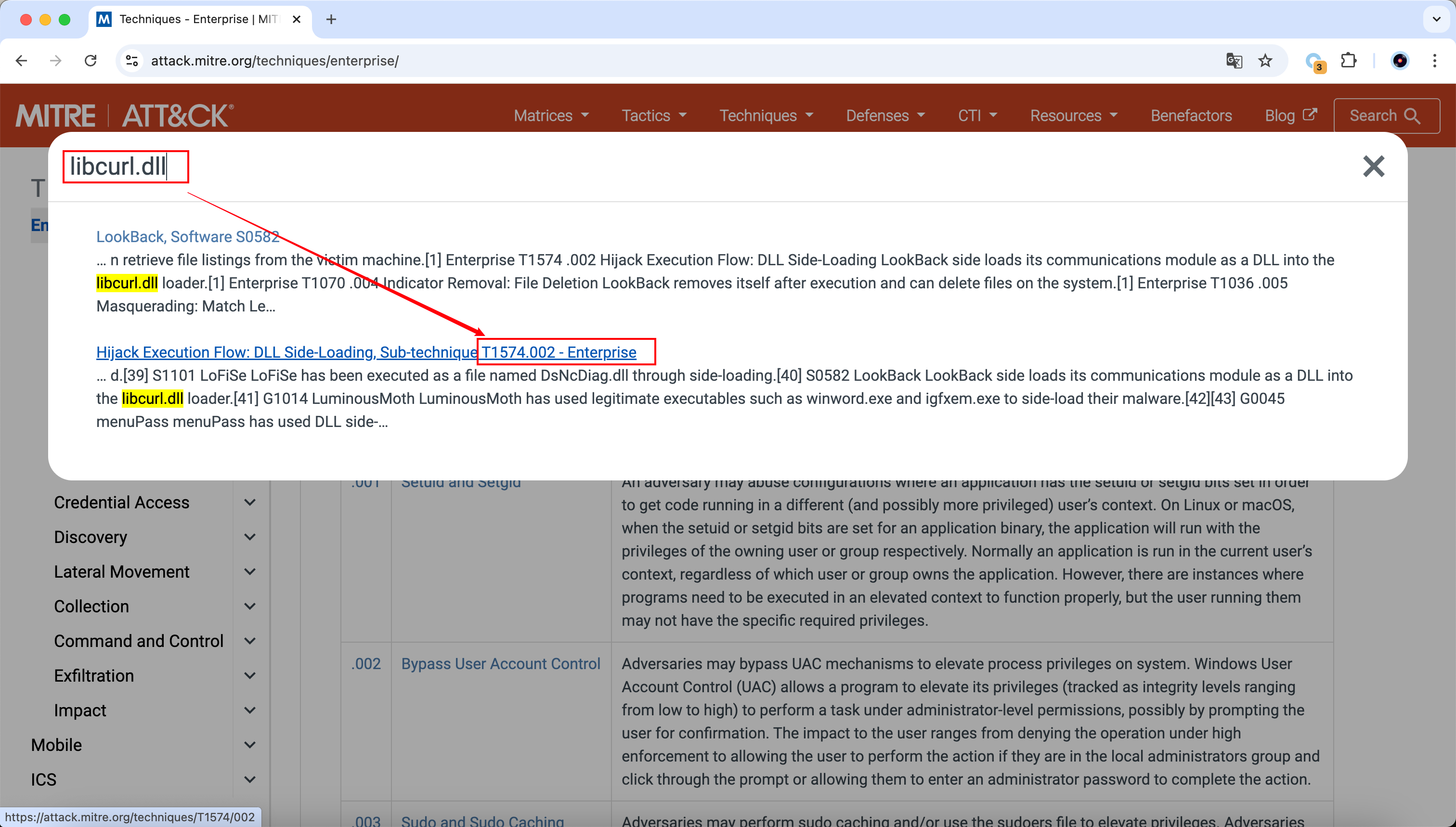 7.MITRE ATT&CK ID 的解释可以先参考一下这篇文章–>一文说清楚 MITRE ATT&CK 威胁框架,基本确定这个可能就是一个 APT 或者是一些大神发现的白+黑绕 EDR 的手法被开源出来,直接跑官网去搜了一下这个 dll 的名字libcurl.dll