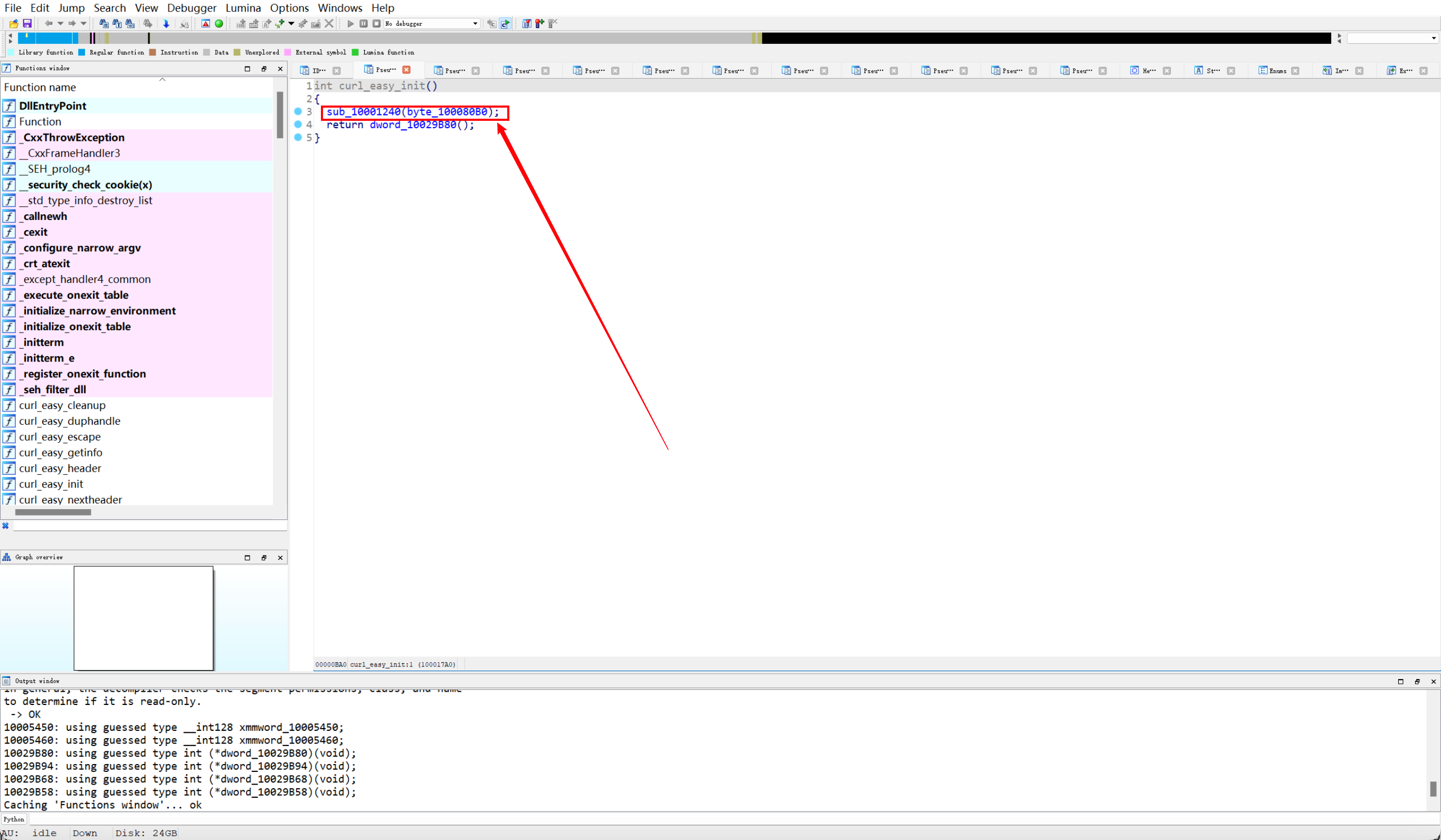 这四个函数,那就着重先看这个四个函数,查看下交叉引用很明显的就能发现 curl_easy_init 这个函数是一个被劫持的函数,其他三个函数都只是去 return 了 data 段中的值,只有 curl_easy_init 这个函数去调用了 sub_10001240()函数,且里面就是一段解密的函数,然后去分析这一段解密函数