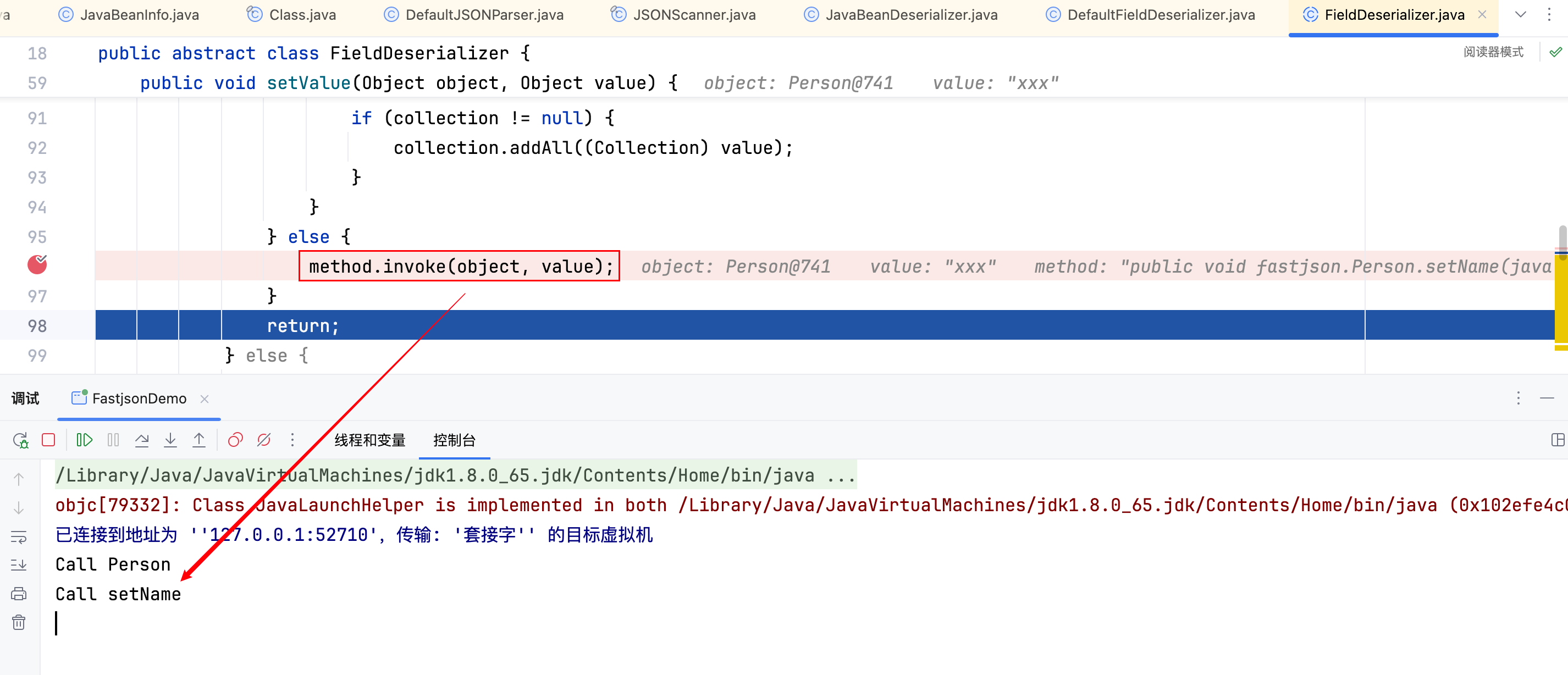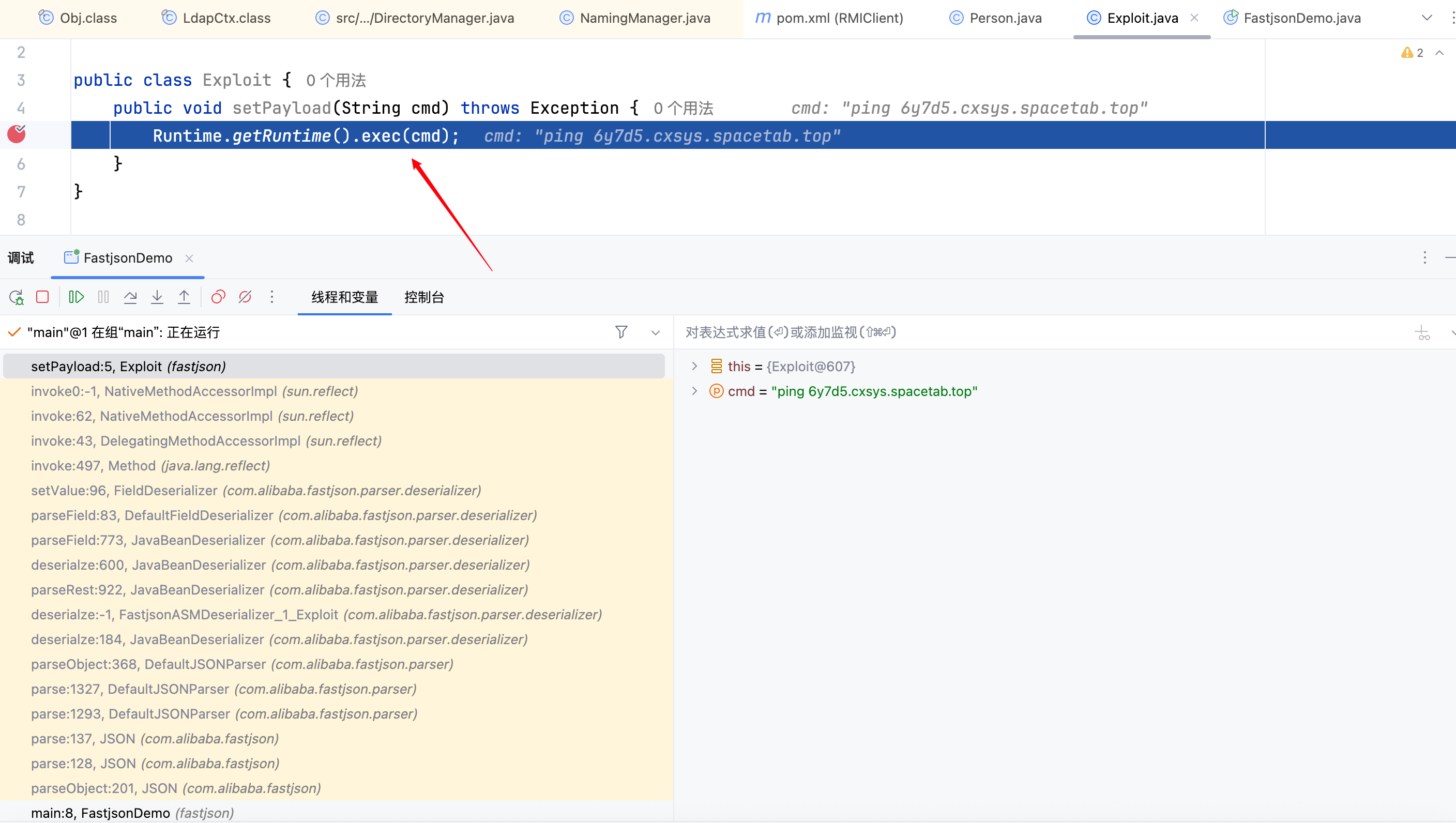 在 Exploit 类的 setPayload 方法下断点,调试运行 FastjsonDemo 类,会发现代码成功的走到断点处–>