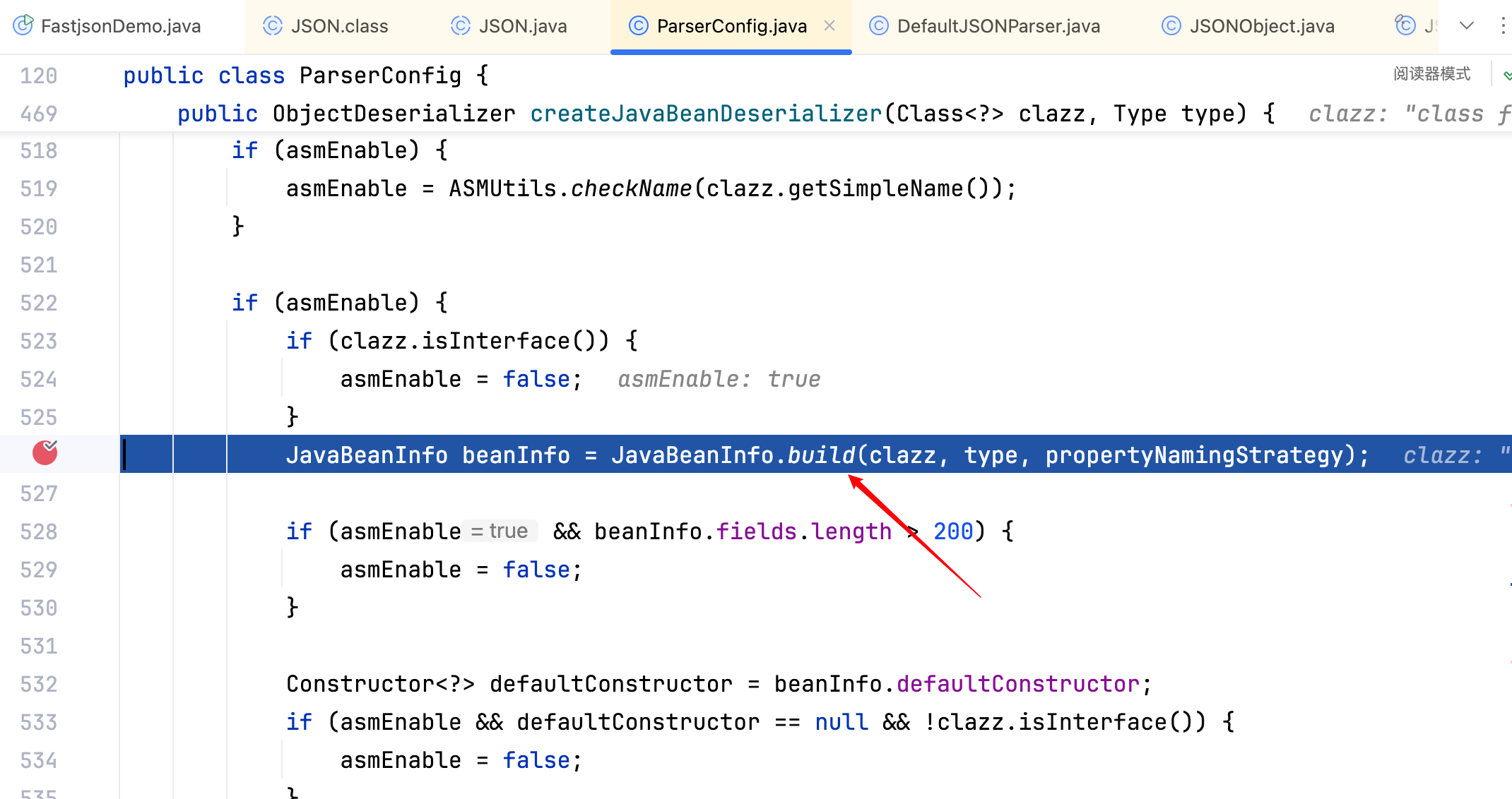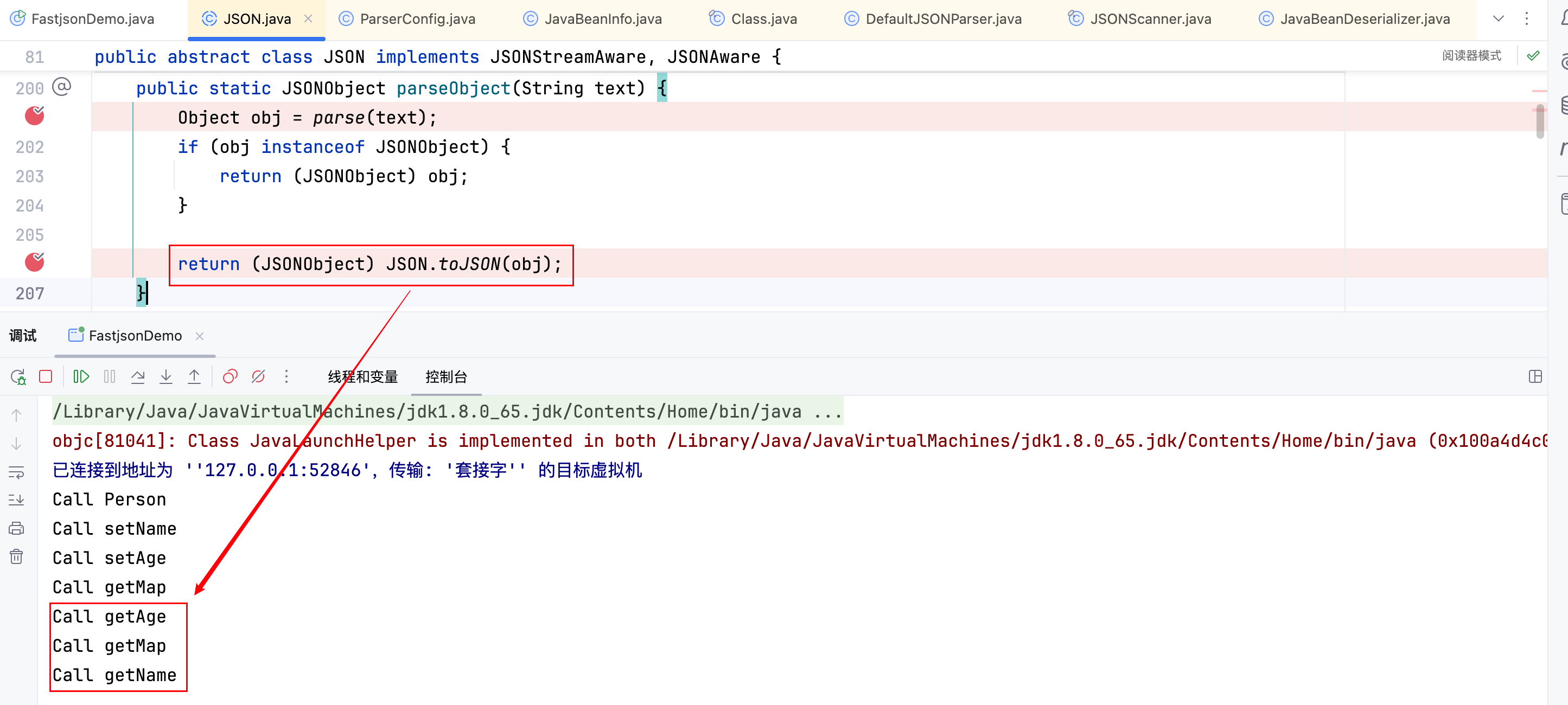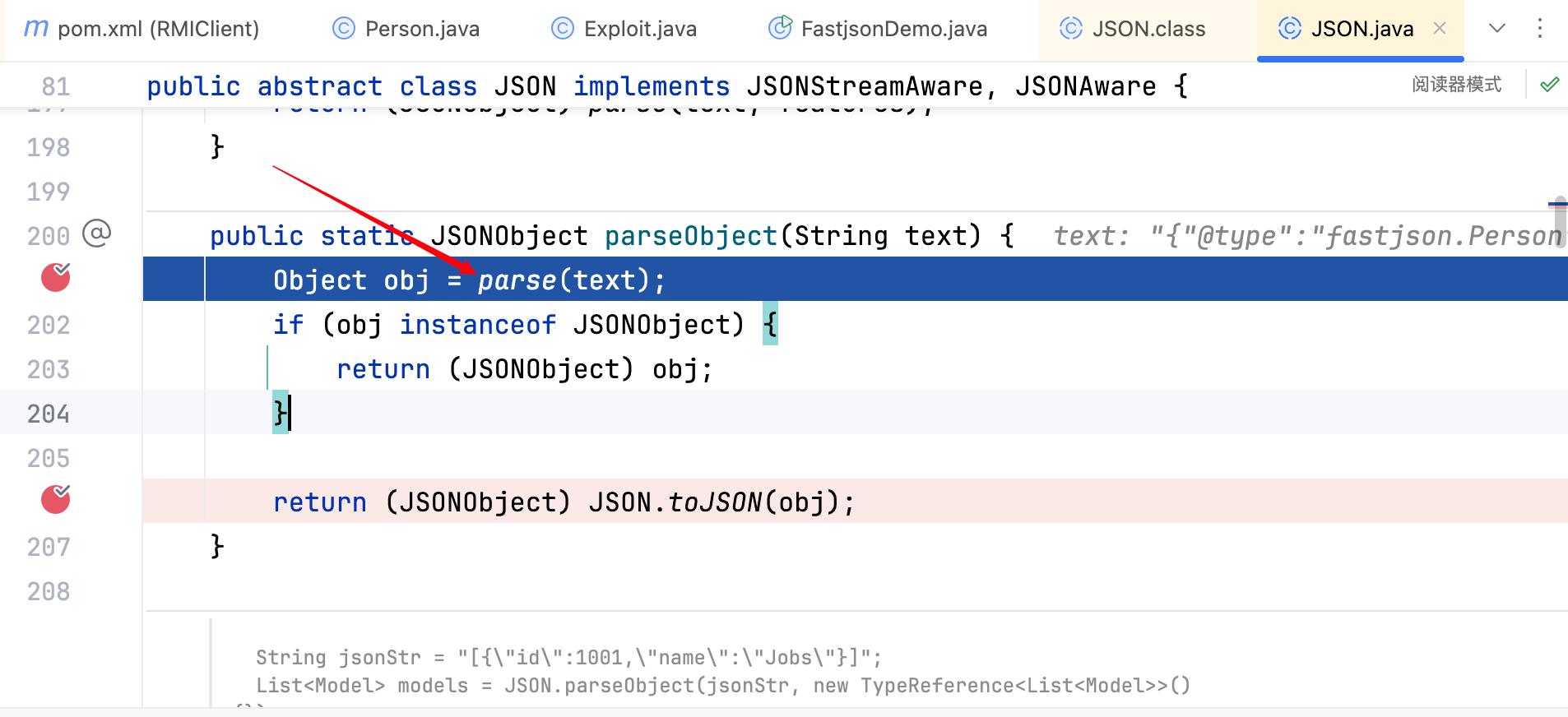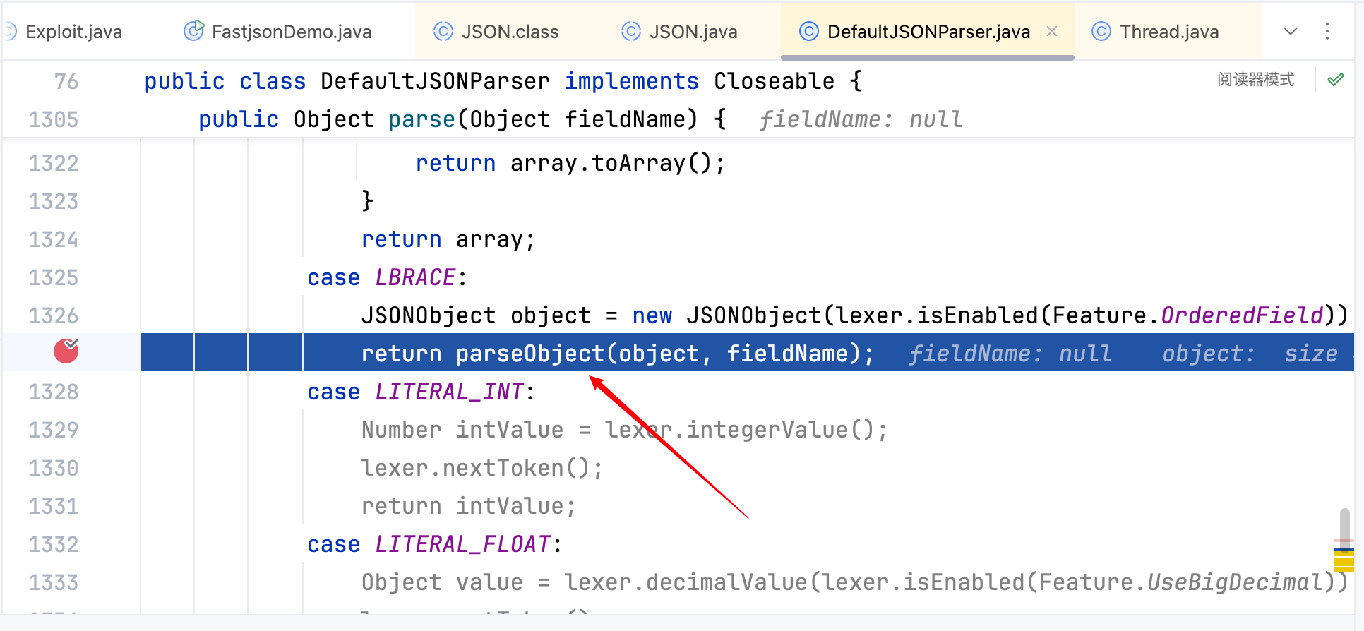 一行下断点开始调试,跟进入 parseObject 方法,如下–>