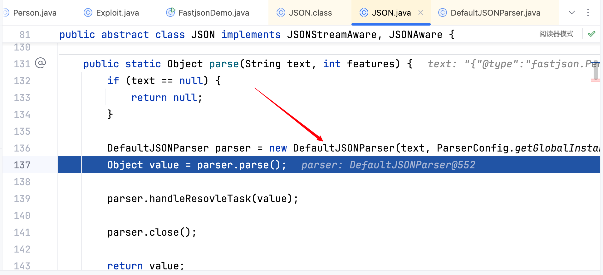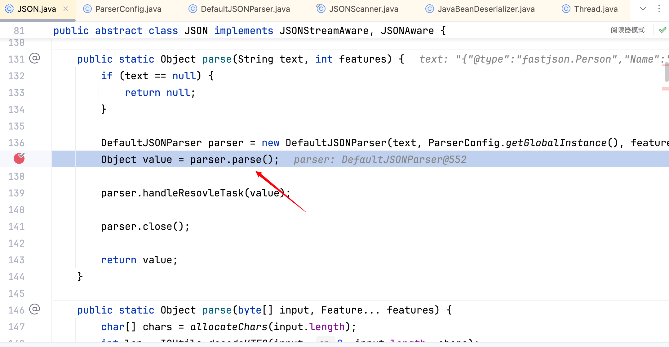 其中 DefaultJSONParser 这行代码创建一个 JSON 解析器 DefaultJSONParser 实例,用于将 JSON 字符串反序列化为 Java 对象,里面会准备好上下文配置环境(包括 AutoType 的启用状态、类加载器、字段策略等),这里就不跟进去了,里面代码确实是挺啰嗦,直接跟进去Object value = parser.parse();