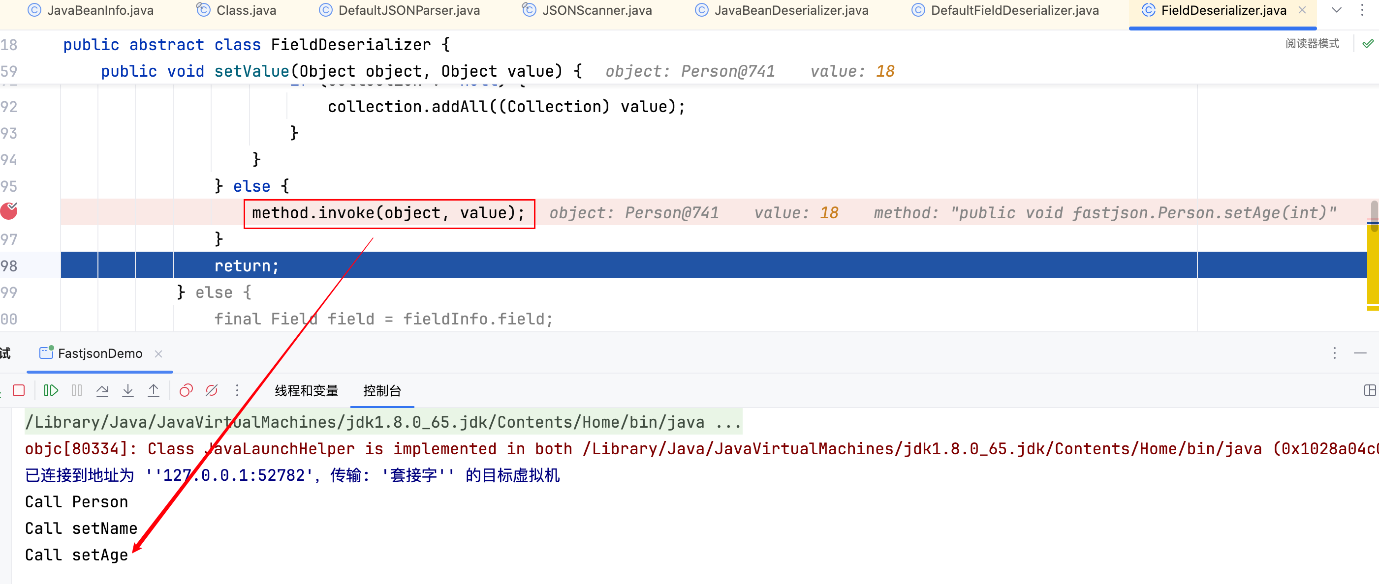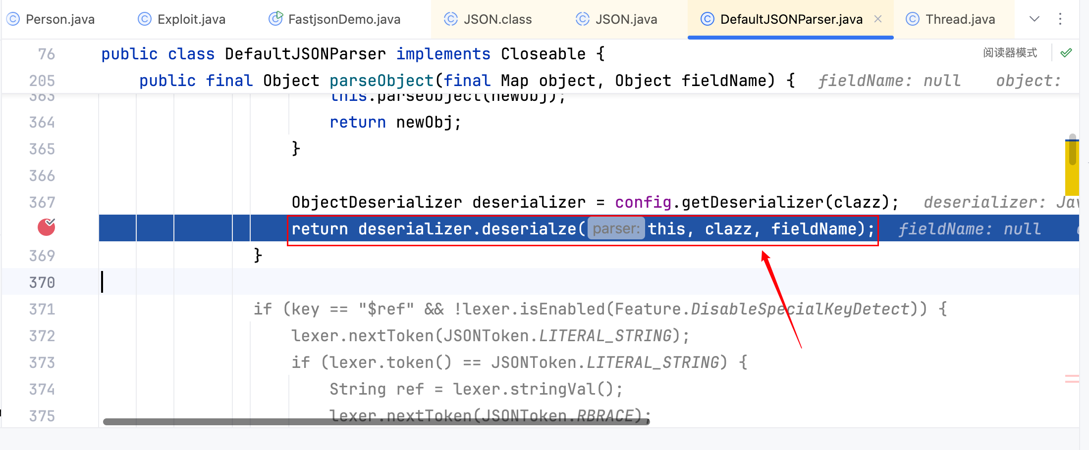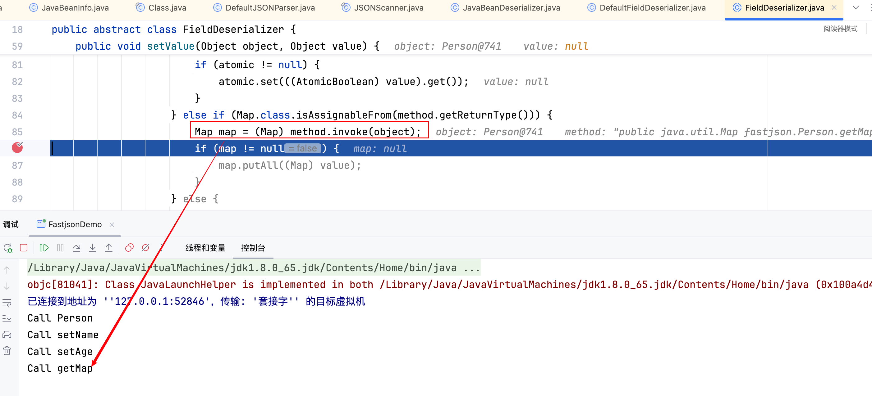 分别对应着识别所有 setter 方法、识别 public 非 static/final 变量、最后识别 getter 方法。(限制:没有被前两个循环识别过,且限定返回类型为集合、Map 或 Atomic 类,所以一开始就在 Person 类中去刻意写了一个 getMap 方法)这点很重要,接着没啥要看的了,直接 return 了,最后是拿到一个叫做 JavaBeanDeserializer 的反序列化器。