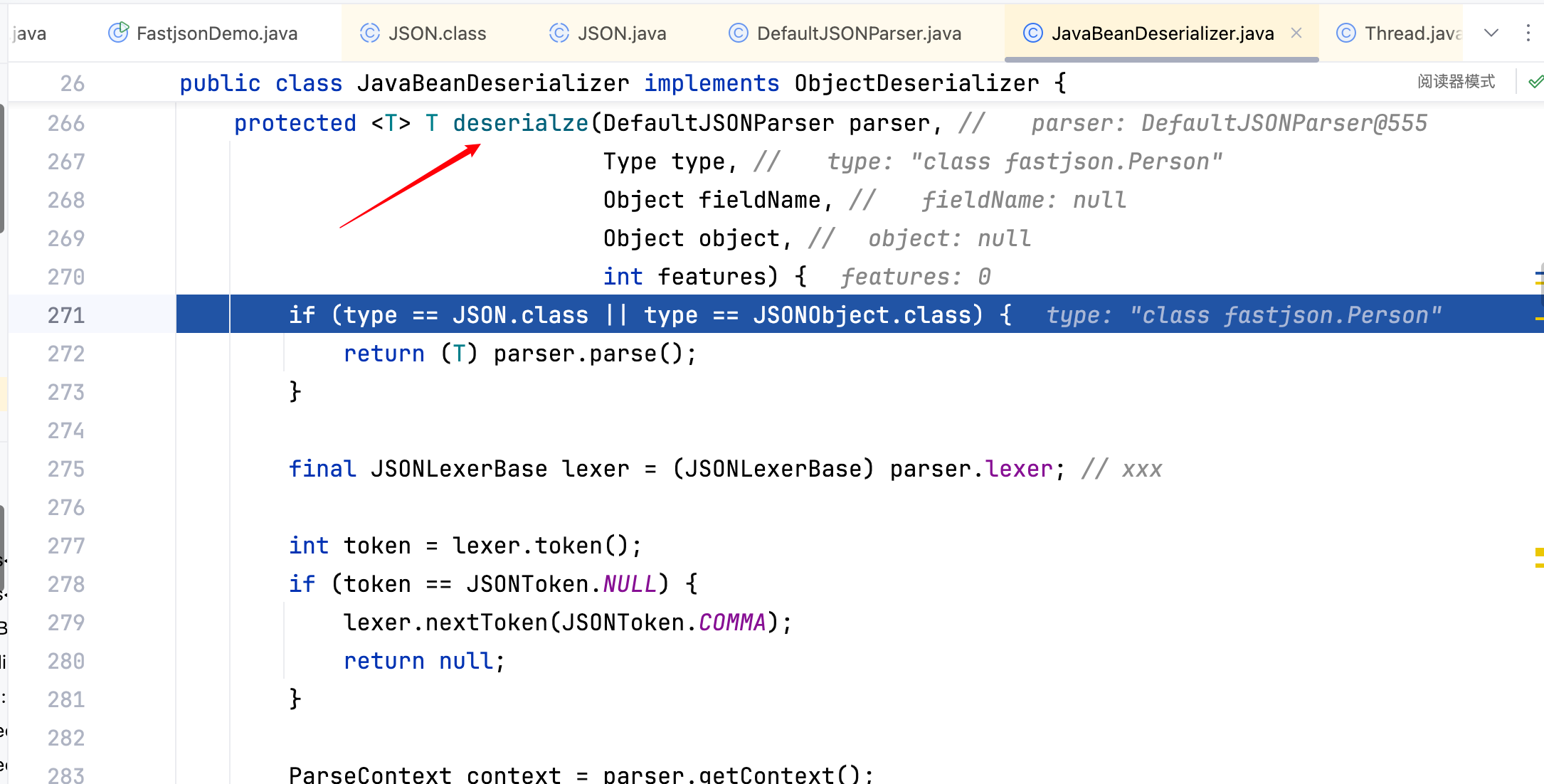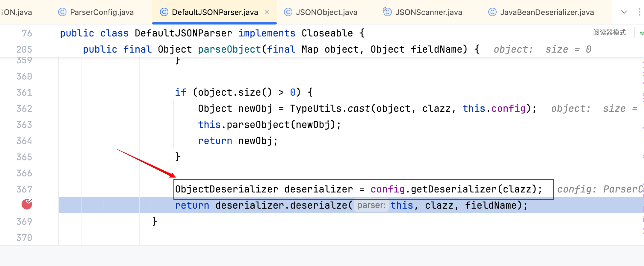 接着跟进去return deserializer.deserialze(this, clazz, fieldName);