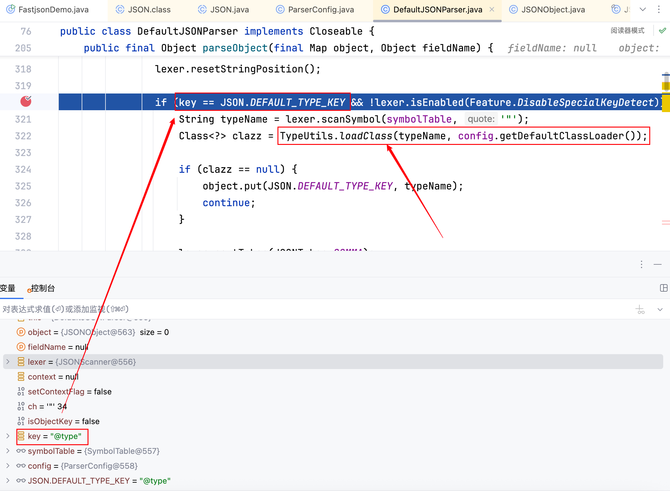 其中第一个关键的点是,当代码发现 json 中的 key 为 @type 的时候,就会去加载这个 @type 的 value 中指定的 Class 类,如下–>