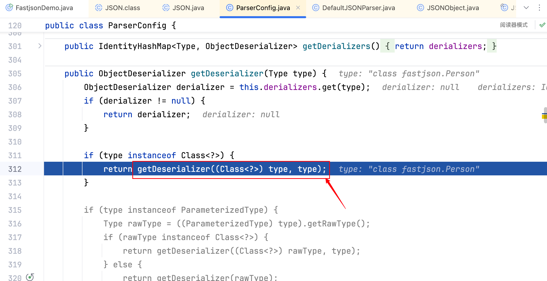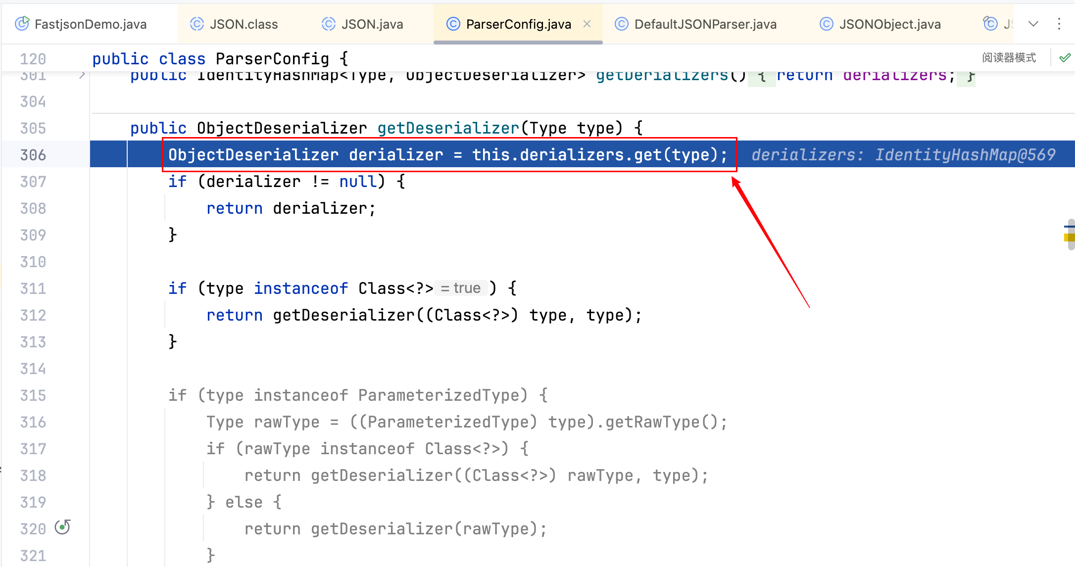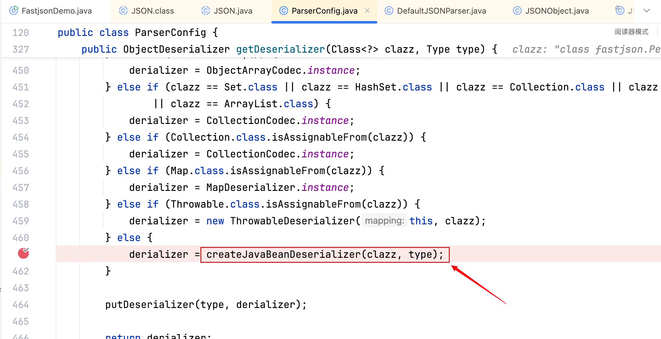 接着再向下跟到ObjectDeserializer deserializer = config.getDeserializer(clazz);