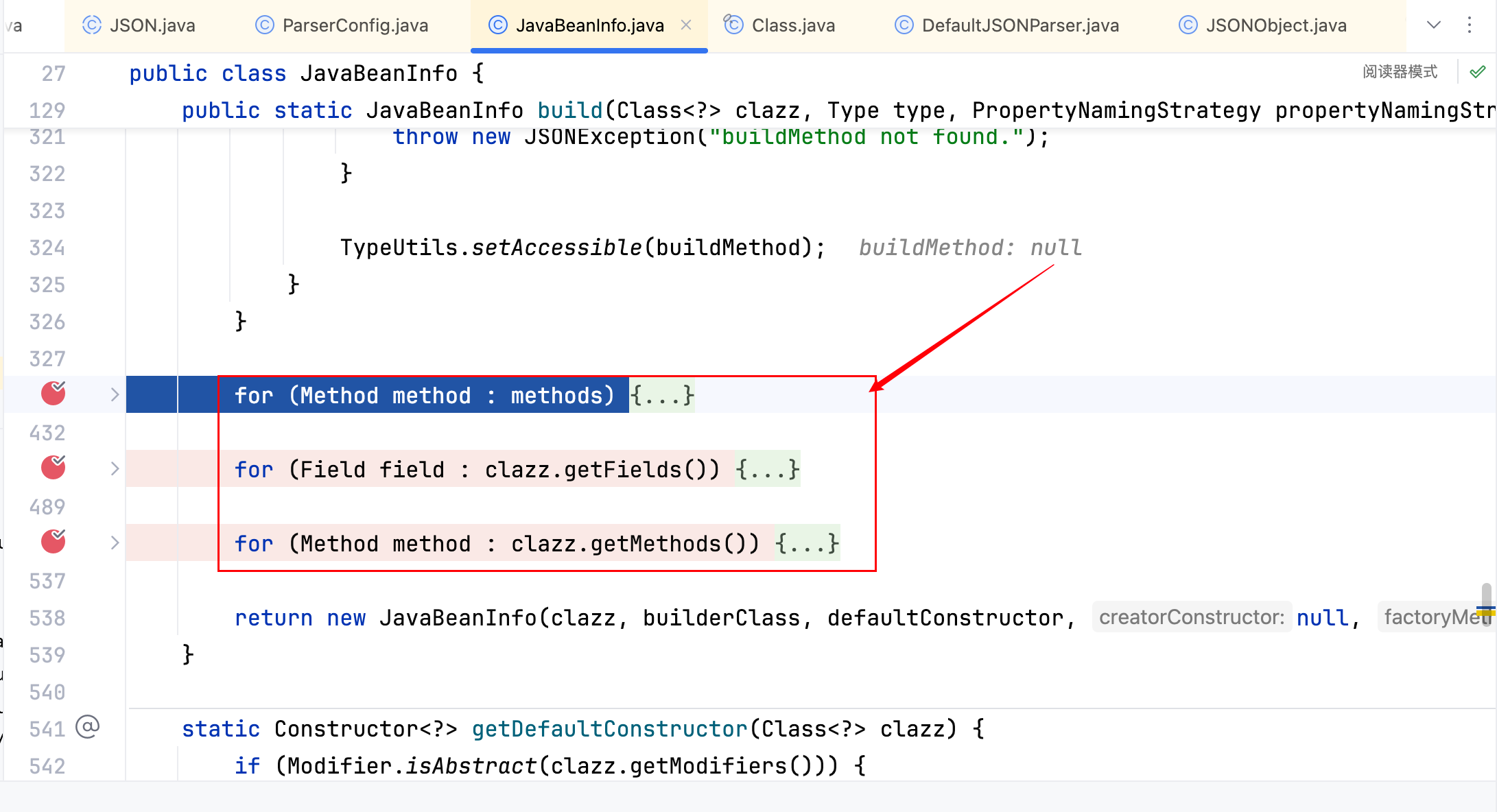 这也就是上文中提到的漏洞精髓点中的第二点,它在代码层的表现形式就是如此!之后就没什么值得跟的了,一路回到开始的地方,调用JSON.toJSON(obj);