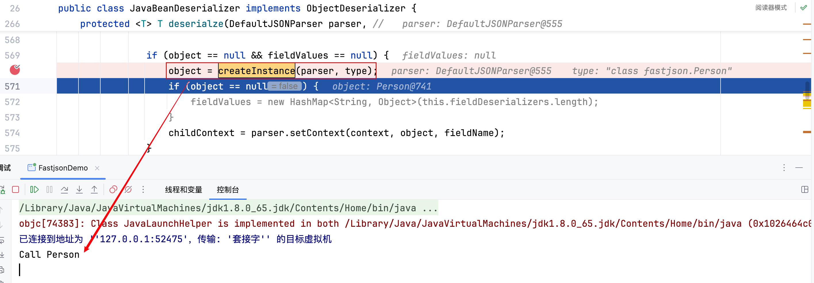 顾名思义,这里开始就要进入真正的反序列化流程了,其中代码很乱,遂只记录其中关键点,首先是创建 Person 实例,如下–>