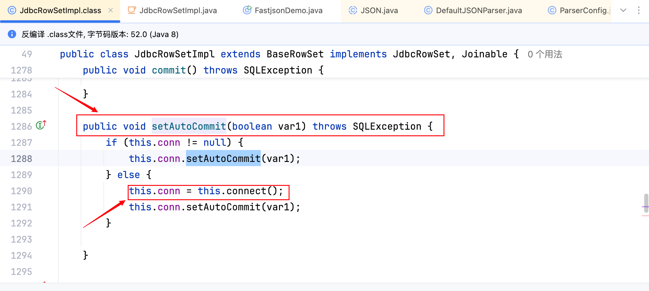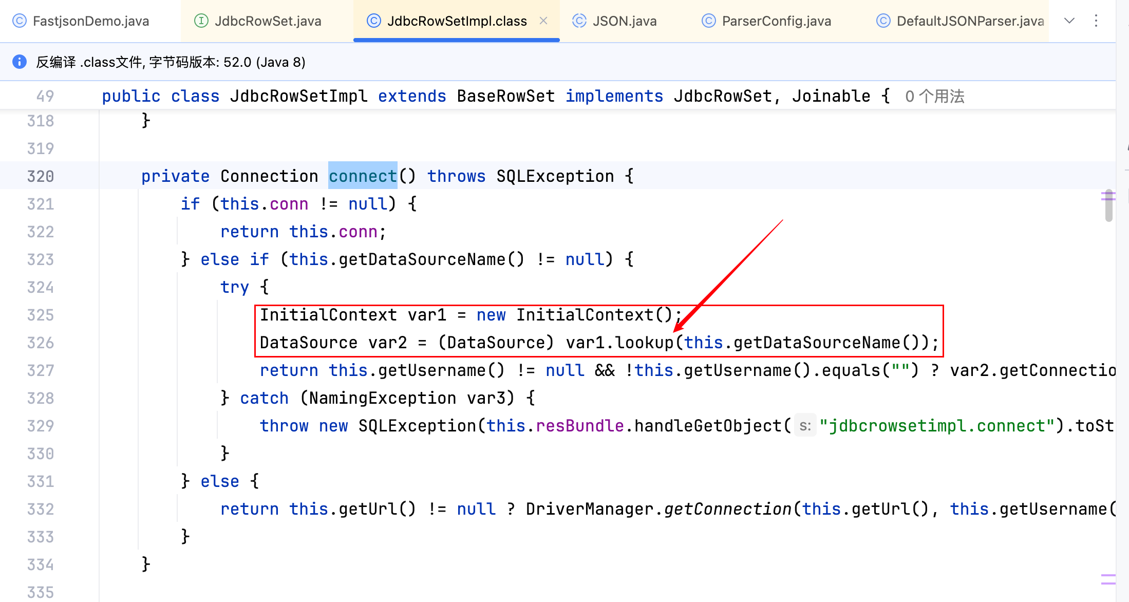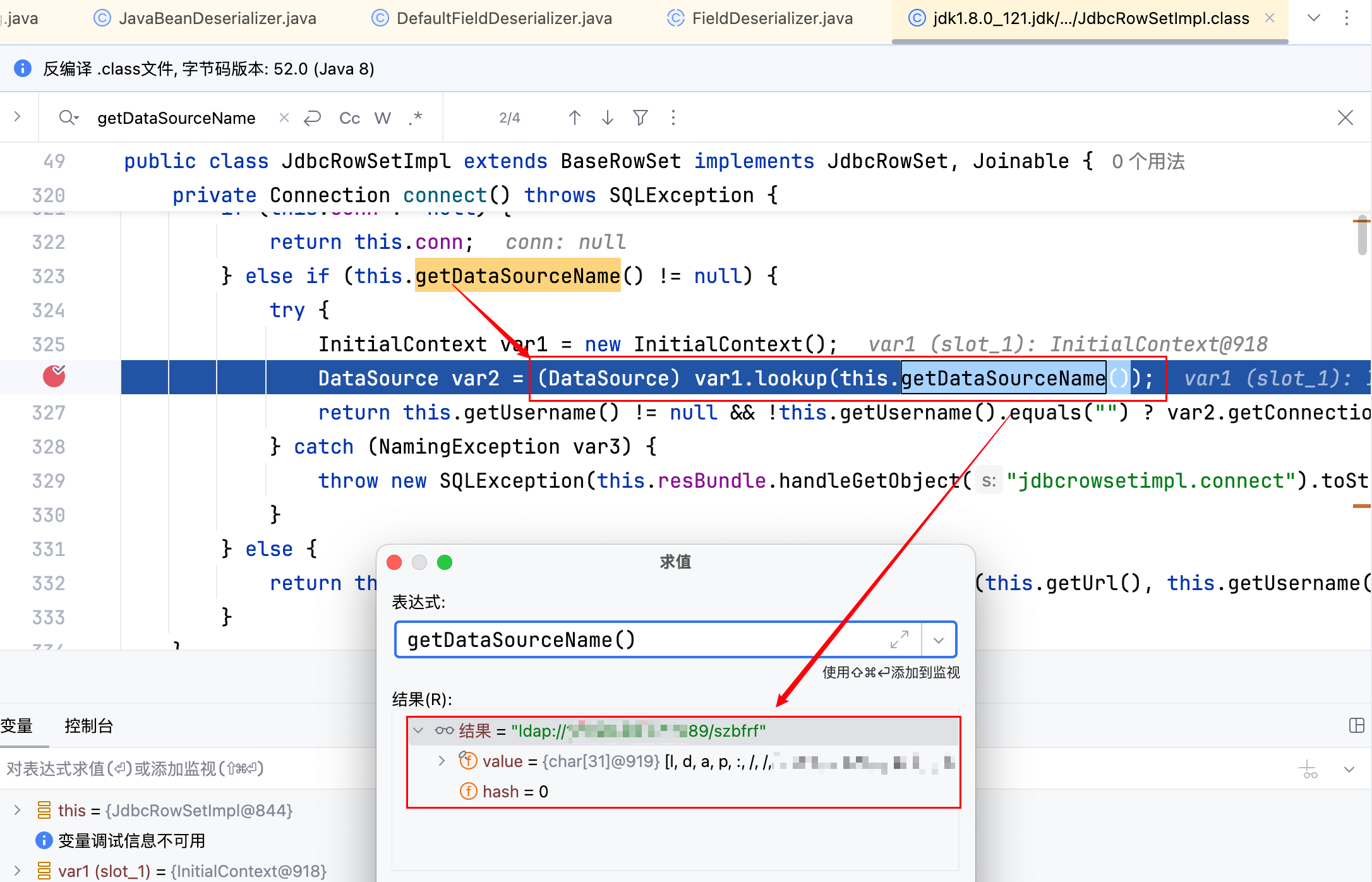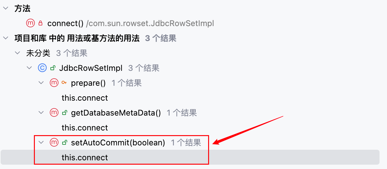 而 JdbcRowSetImpl 类的 setDataSourceName 方法应该如何进一步向上跟,上文也已经给出了答案,写成{"@type":"com.sun.rowset.JdbcRowSetImpl","DataSourceName":null}