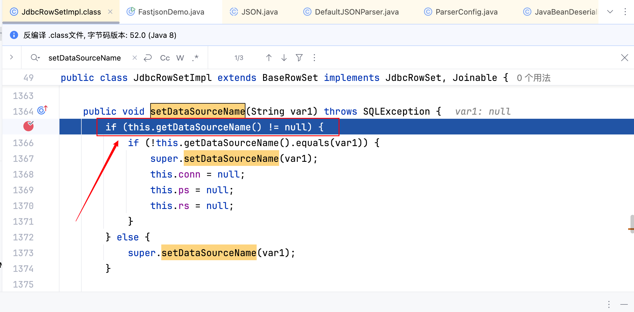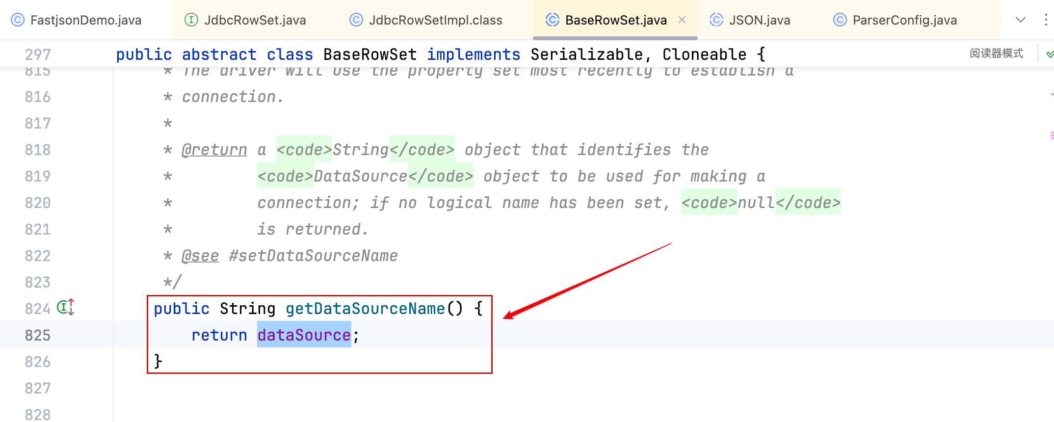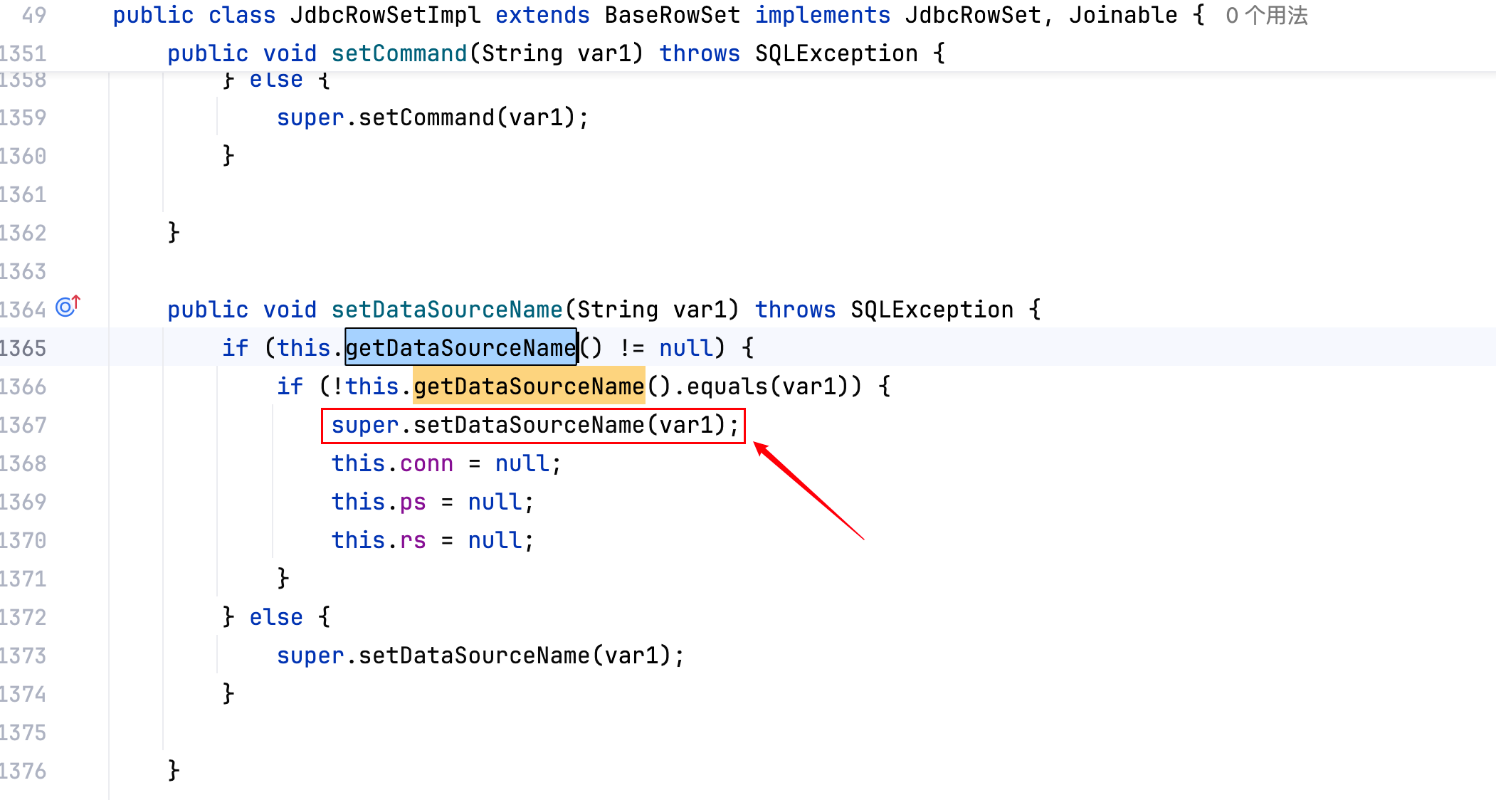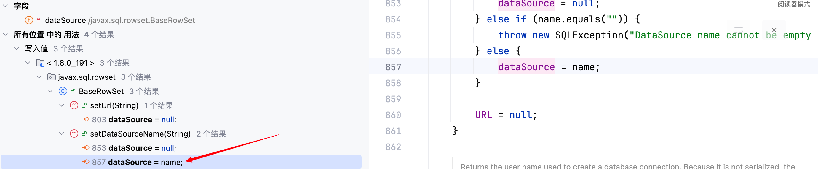 可以看到是在 BaseRowSet 类的 setDataSourceName 方法中,而这个 setDataSourceName 其实在 BaseRowSet 类的子类 JdbcRowSetImpl 中就已经被调用到–>