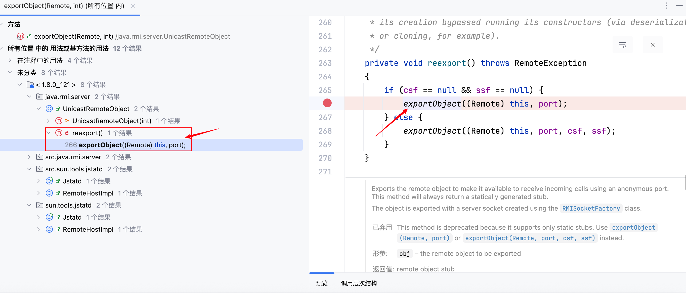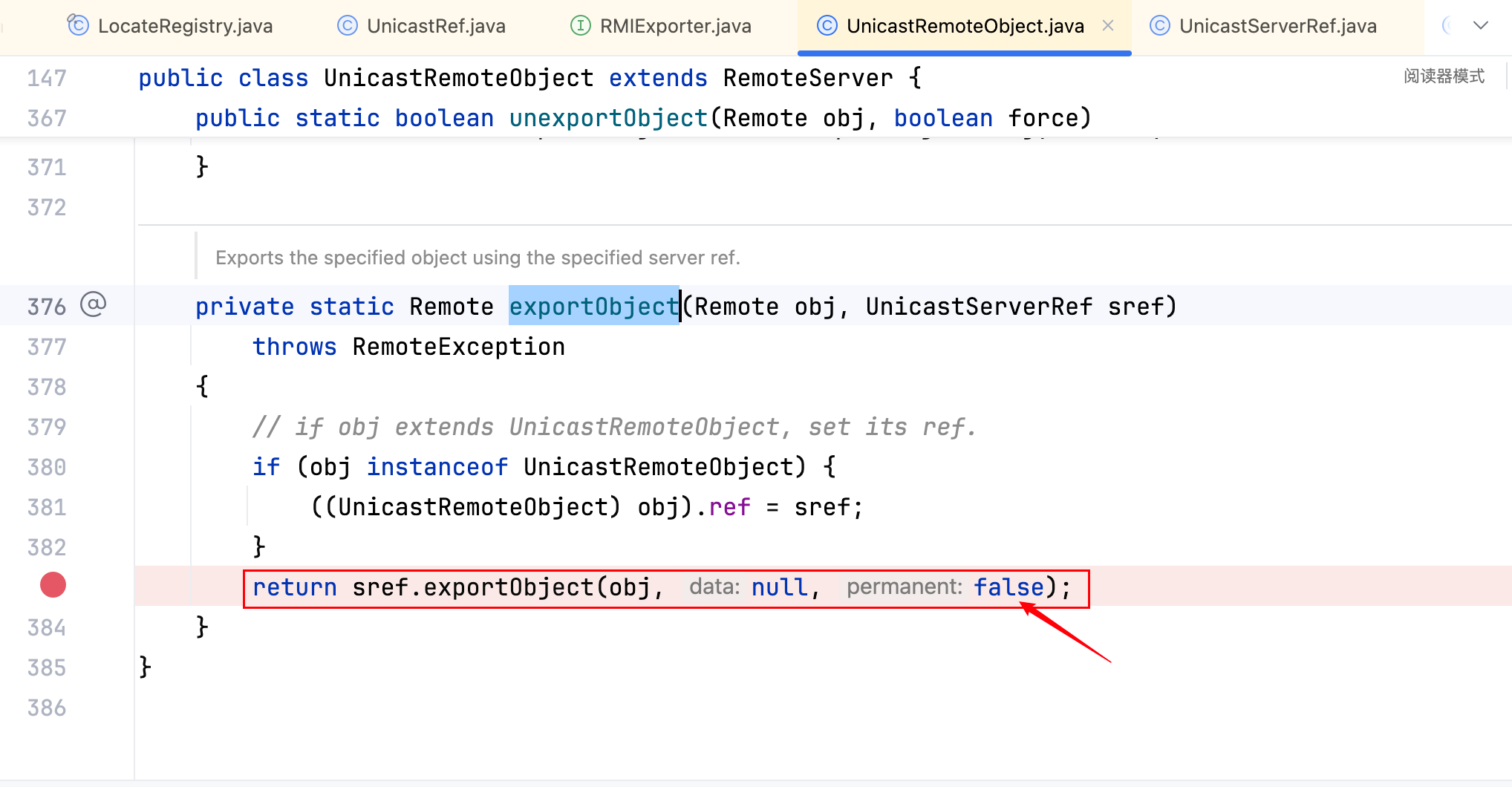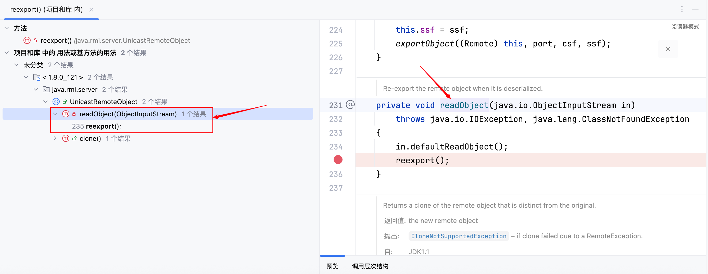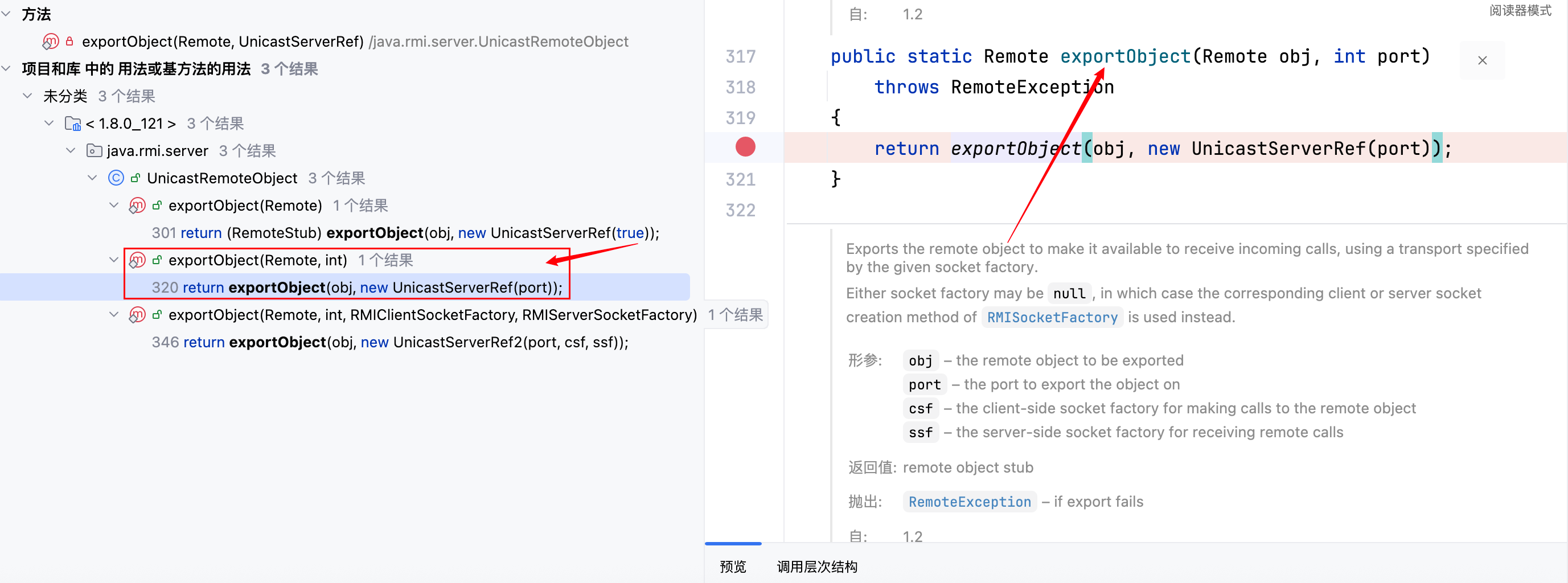 从上图的代码往后开始,就是一路到 UnicastServerRef 类的 exportObject 方法、创建 stub(ServerStubs)、启动 socket、发布 Target等一套标准的创建 Server 端的流程。那就从上图中的代码再向上跟,看看是否可以跟到一个 readObject,一层一层去查看它的方法调用–>