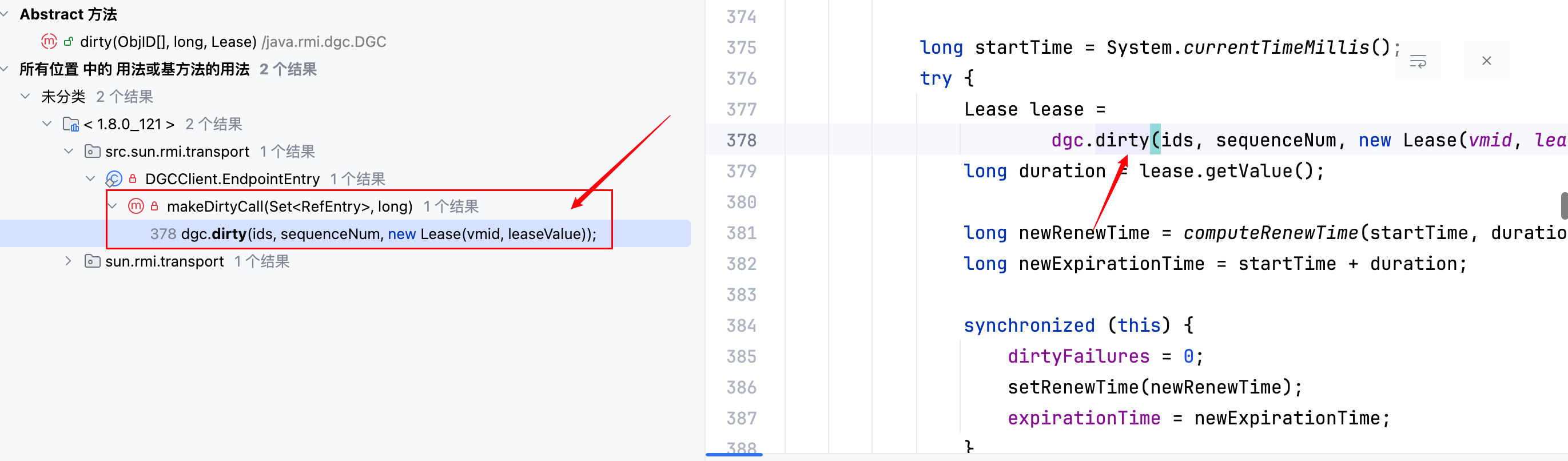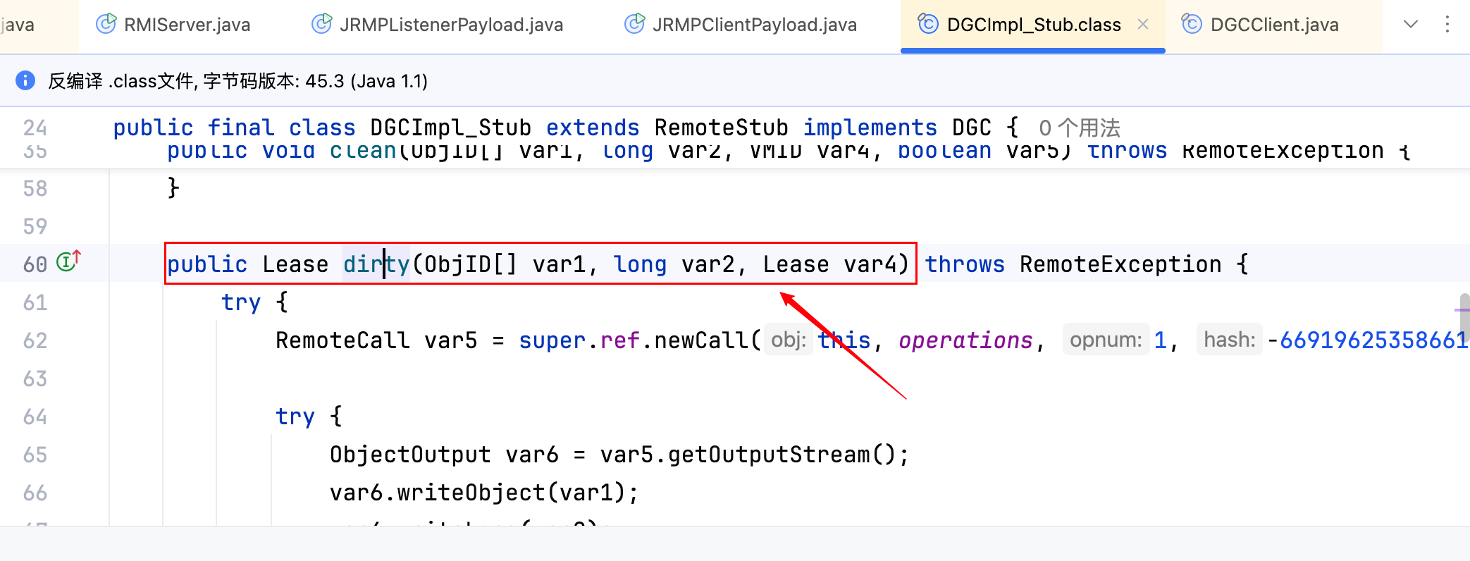 既然是要去伪造一个 Client 端,那肯定就是要去找创建 Stub 相关的逻辑,然后一层层向上跟,看看有没有能到 readObject 的,其实和上面第一条 Gadget 都是一个挖掘逻辑。这里 Ysoserial 的作者选择了去看 DGCImpl_Stub,Sink 是选择了它的 dirty 方法,如下–>