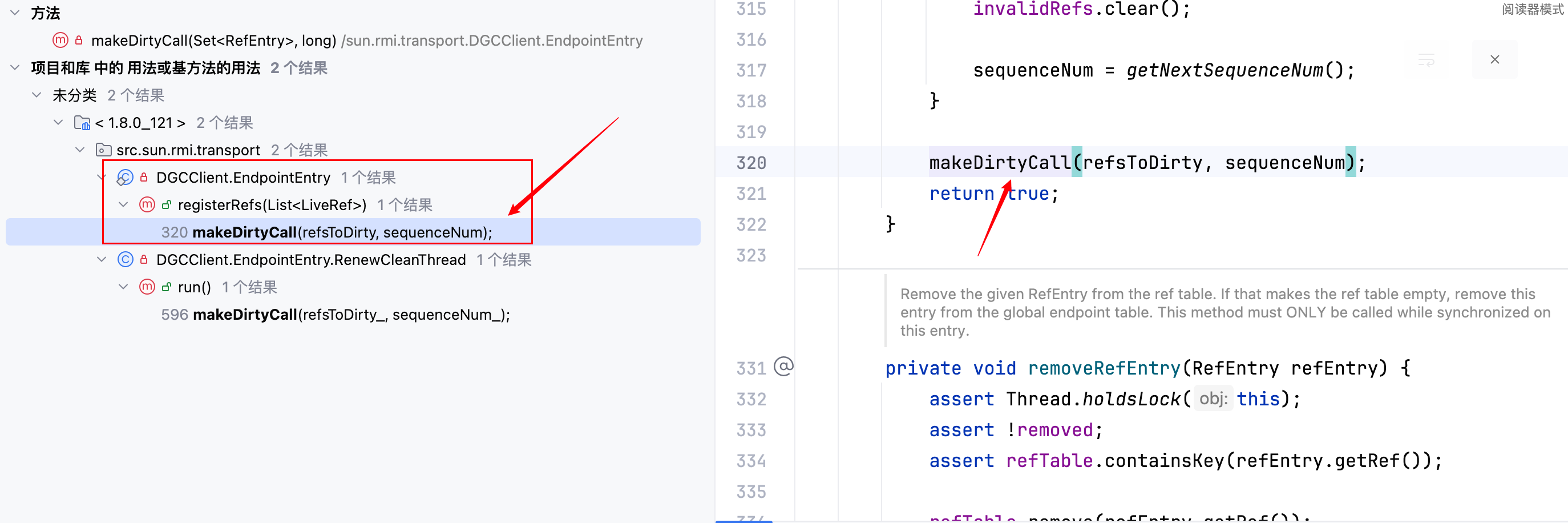 有两处调用,其中下面那处顾名思义是清理后台线程相关的代码,不关注,选择上面public boolean registerRefs(List<LiveRef> refs)