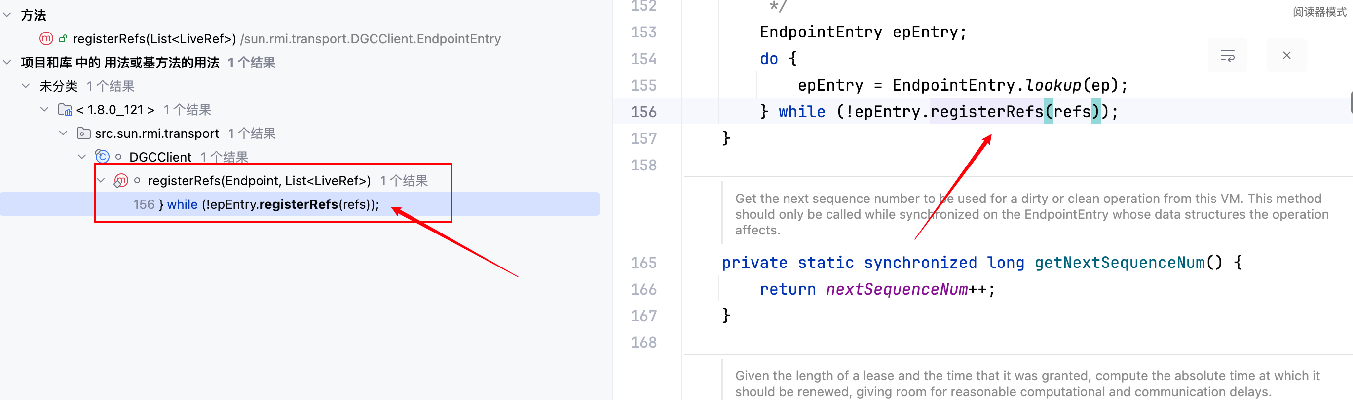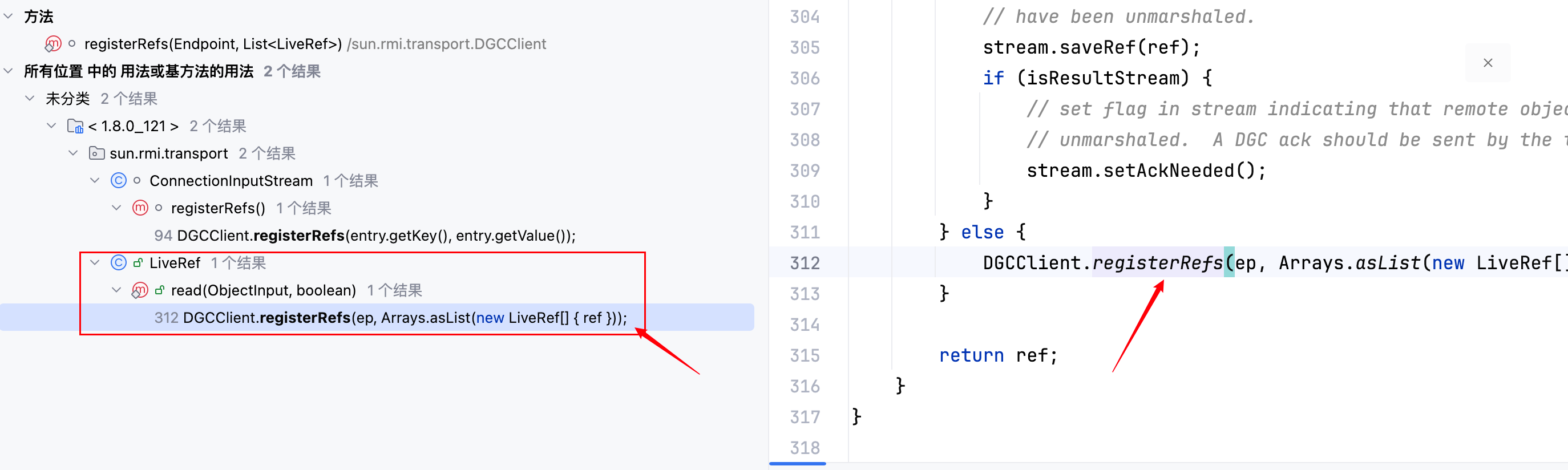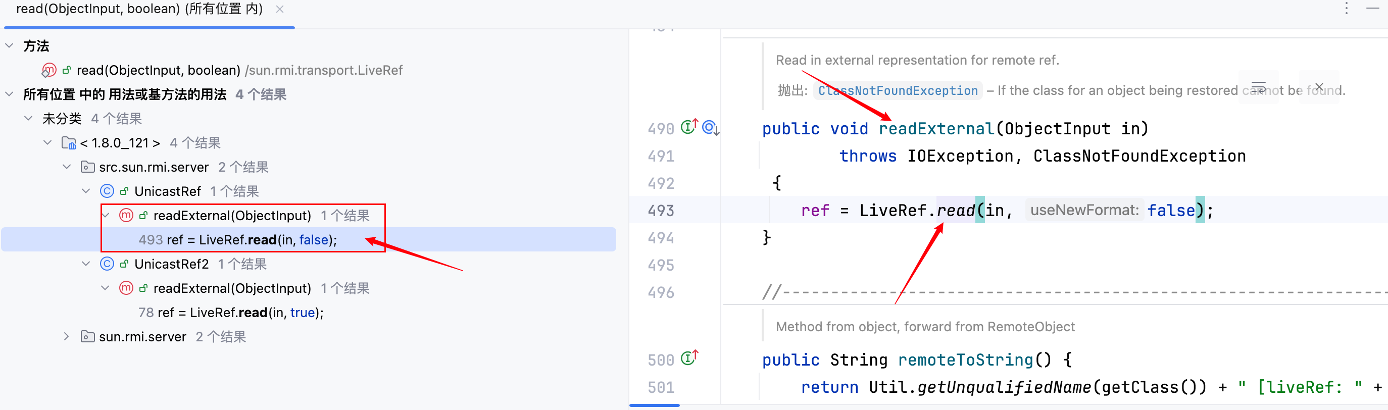 一共有两处调用,记得组长是走的第一处,而 Ysoserial 的作者是走的第二处,跟一下第二处public static LiveRef read(ObjectInput in, boolean useNewFormat)