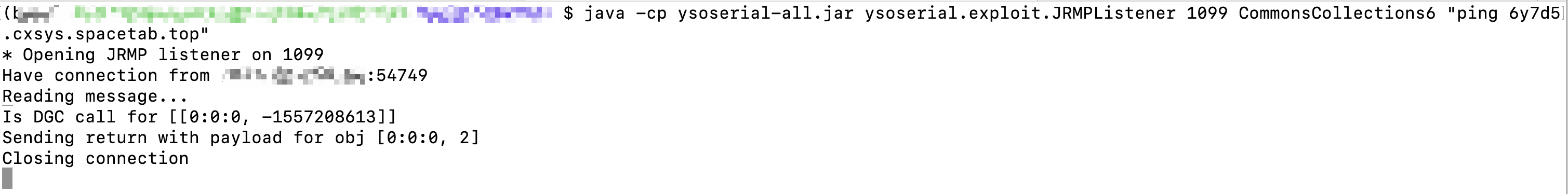 接着去伪造一个 Server 端,直接用 Ysoserial 中 ysoserial.exploit.JRMPListener 这个 Payload 就好,之前记录过,这里不再赘述。开启后,运行上面的 Demo,1099 端口成功收到请求如下–>