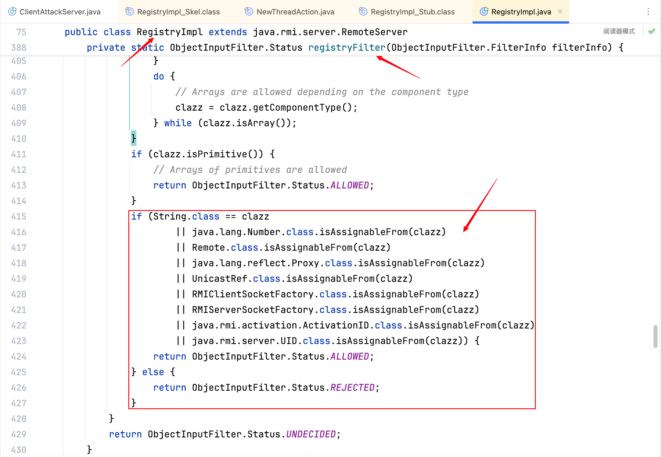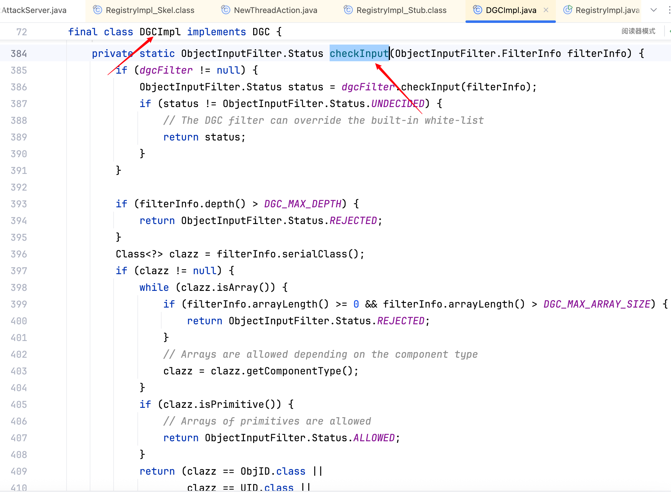 分别在 RegistryImpl 类和 DGCImpl 类中加入了过滤机制,仔细读读代码,其实都用的是白名单的机制,即只允许反序列化特定的类。