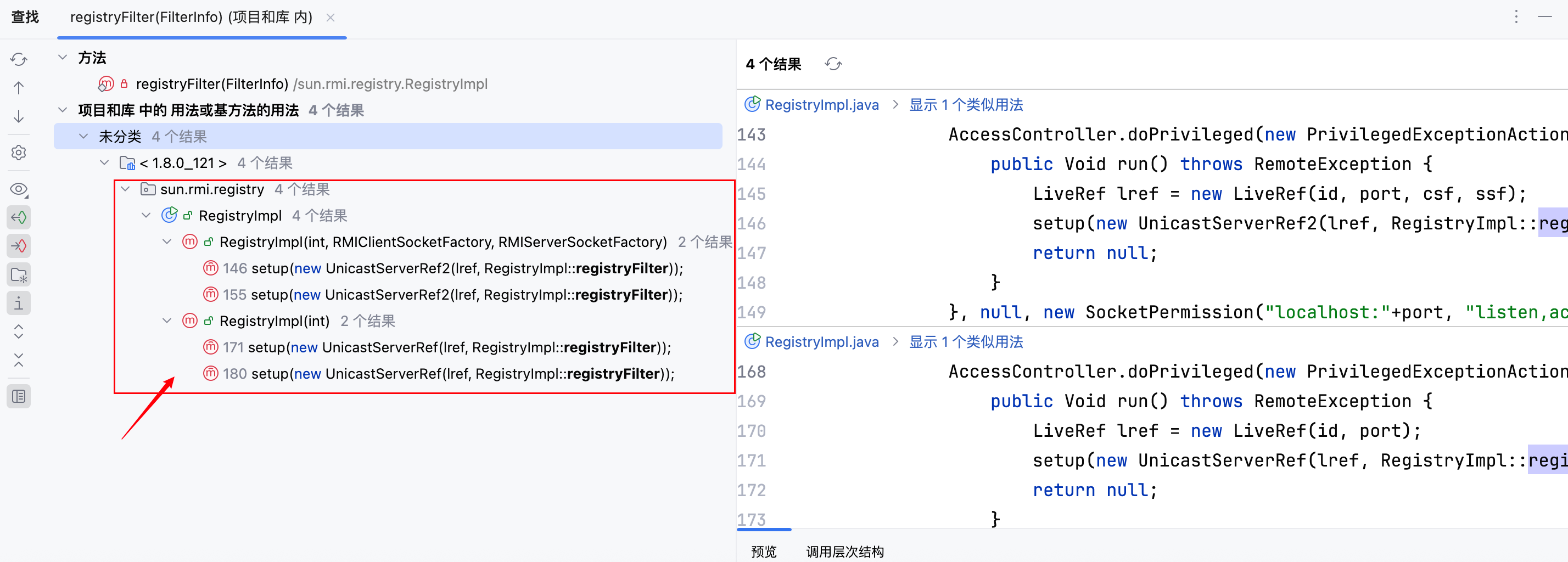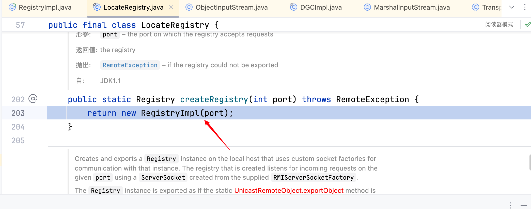 都是在初始化的时候去设置了一个反序列化过滤器,再无别的地方单独调用这两个过滤代码。何为初始化,Register 的初始化就是指着Registry registry = LocateRegistry.createRegistry(1099);