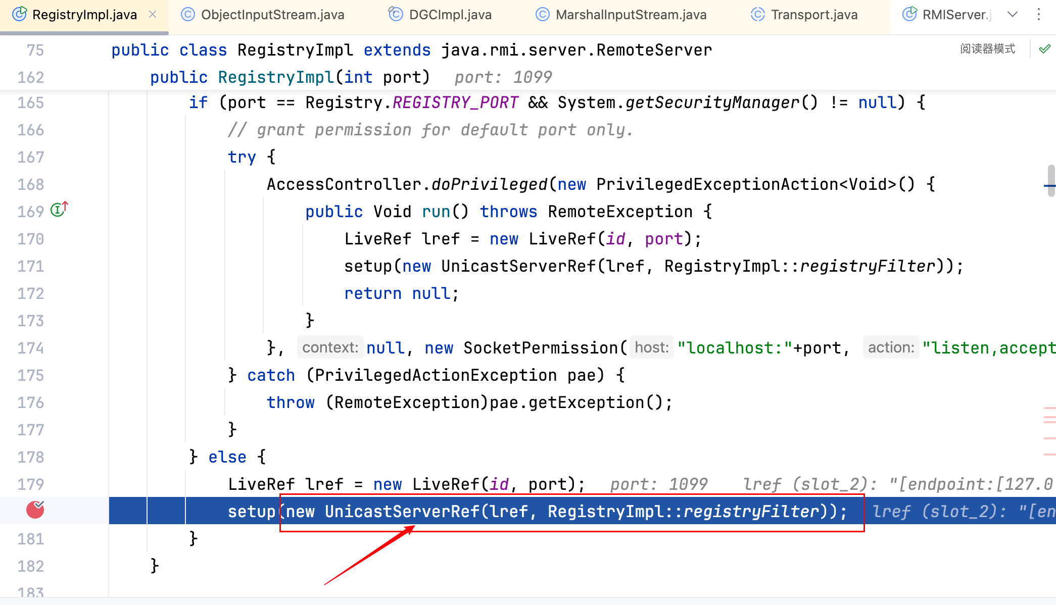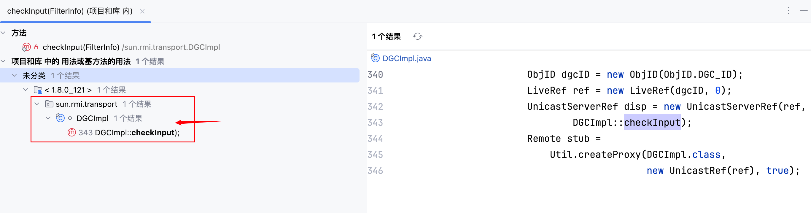 OK,那这个过滤机制是否影响 RMI 通信过程中的每一个阶段呢?显然不是的,那它这个机制在哪个阶段进行了过滤呢?先分别看一下 registryFilter、checkInput 方法的调用情况,如下–>