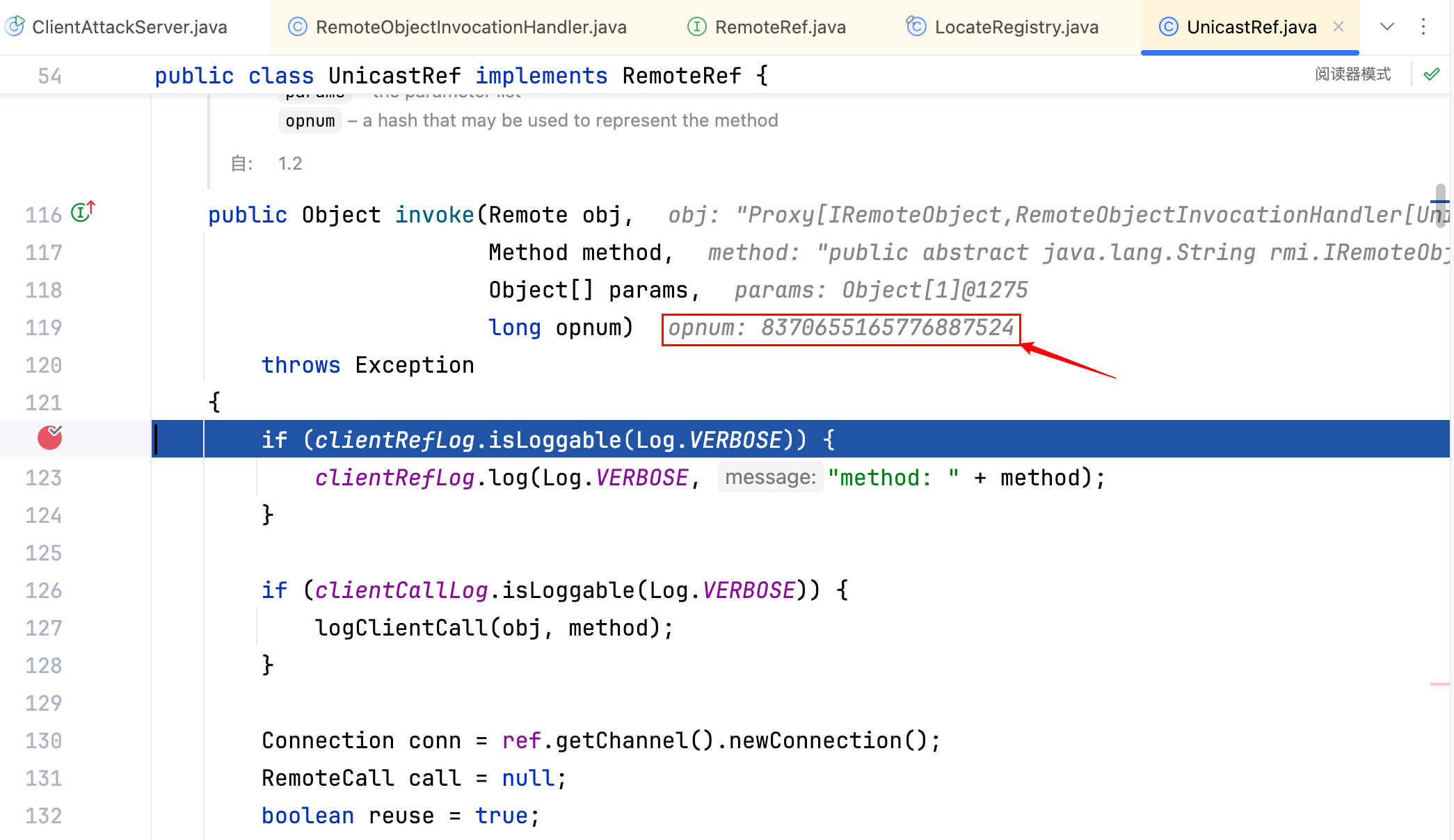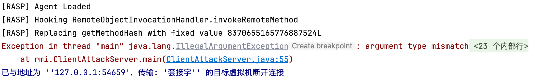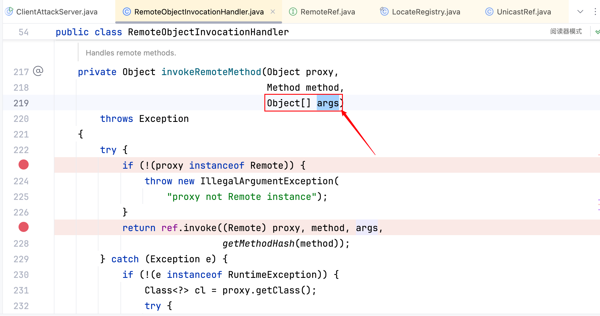 嗯嗯没错,服务端这里是没有做任何防护的。至于怎么去扩大攻击面,之前文章中也提及过,去 Hook Client 端计算 hash 值的方法即可,上次是采用手动 debug 的方式,这次尝试用 RASP 去实现,看网上都是清一色的去 Hook java.rmi.server.RemoteObjectInvocationHandler 类 InvokeRemoteMethod 方法的 args 参数,也就是下面这里–>