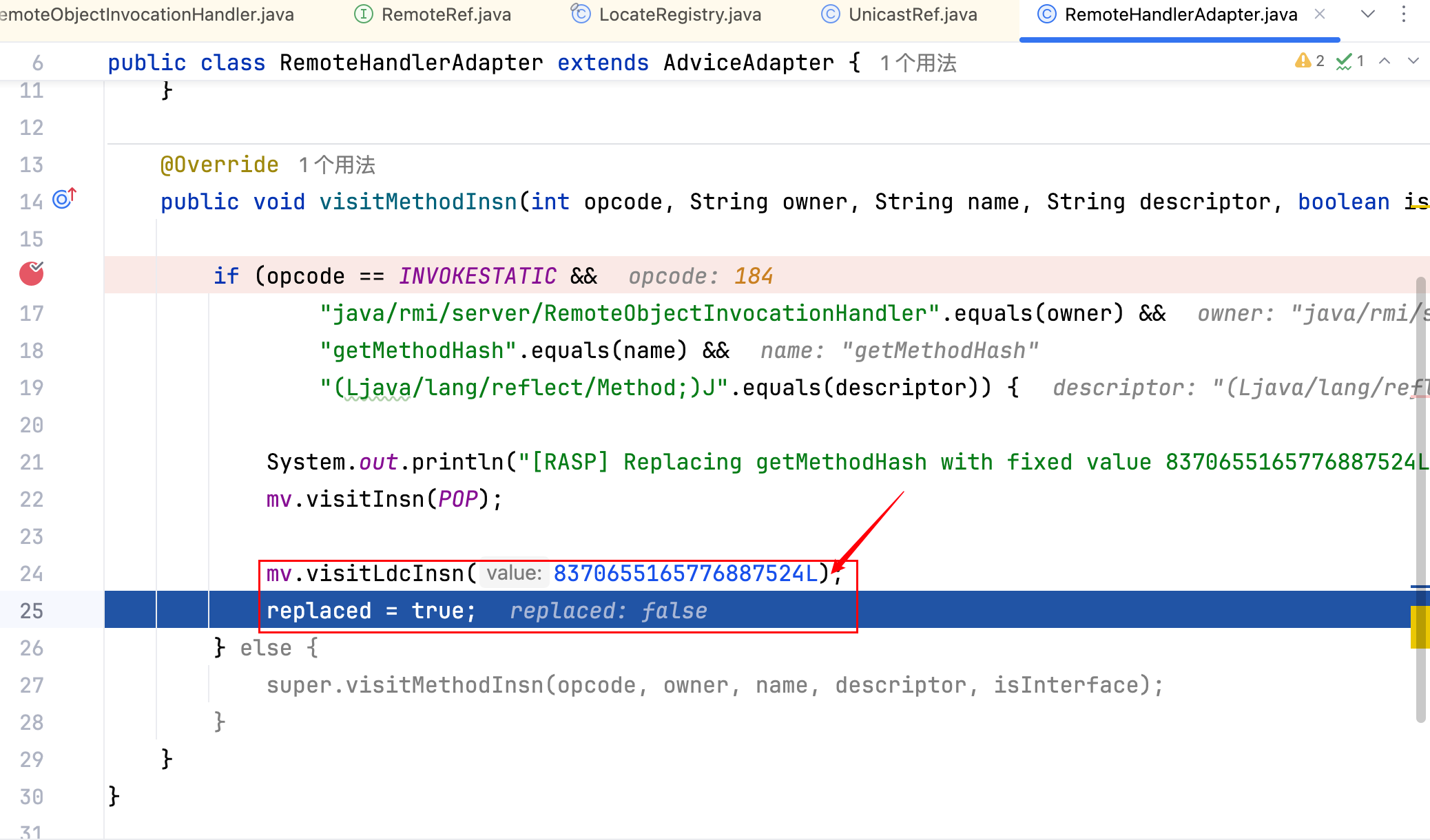 这行代码的第四个参数,也就是不用去手动改 getMethodHash(method) 的返回值了,直接定成一个常量即可,值即为之前提到过的 8370655165776887524L,截三张其中比较关键的图片–>