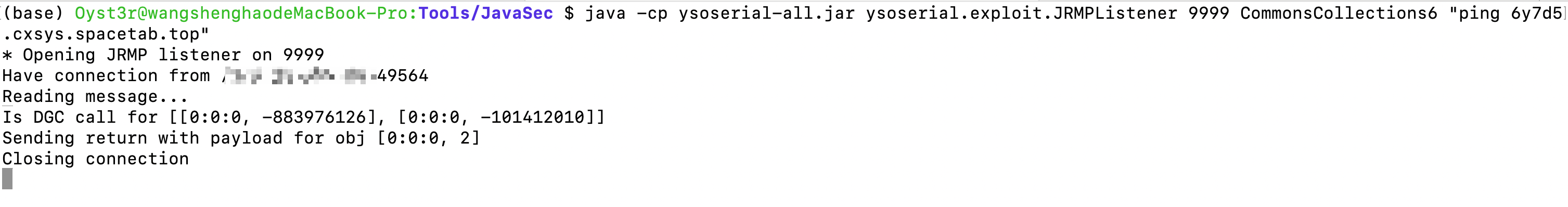 然后直接用 Ysoserial 中 ysoserial.exploit.JRMPListener 这个 Payload 去伪造一个服务端,之后运行 JRMPClientPayload 如下–>